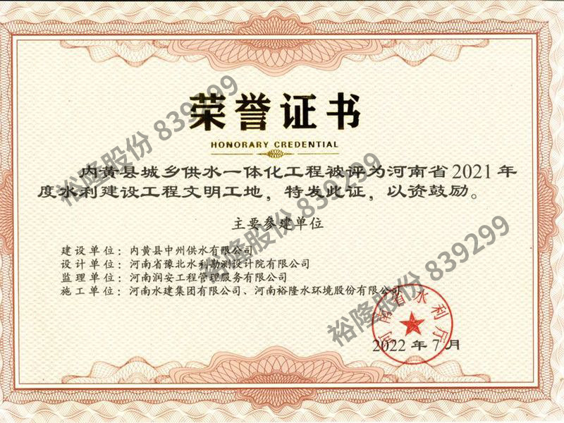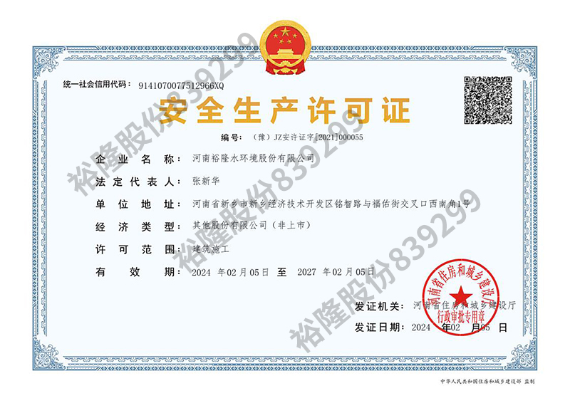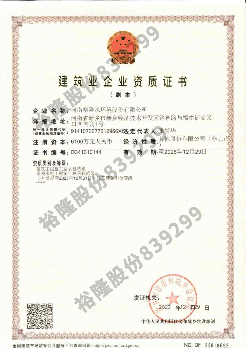 河南裕隆水環境股份有限公司始建于2005年,于2016年9月份在全國中小企業股份轉讓系統(新板)成功掛牌,是河南省成立較早的一家以水利水電施工及相關環境治理為一體的綜合性股份制企業。目前公司擁有水利水電工程施工總承包資質、房屋建筑工程施工總承包資質和環保工程資質等相關資質。公司核心業務為水環境治理(黑臭水體治理)、水生態修復、水利水電施工等板塊。以“誠信合作”的理念在區域內建立了良好的發展和合作網絡,逐步形成提供項目規劃、設計、投融資、建設、運營等一體化生態企業。